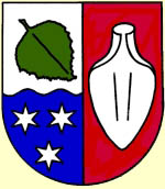 Gespalten, vorn durch Wellenschnitt geteilt, oben in silber ein geschrägtes grünes Birkenblatt, unten in blau 3 (2.1) silberne sechsstrahlige Sterne, hinten in rot eine silberne Pflugschar pfahlweise gestellt.