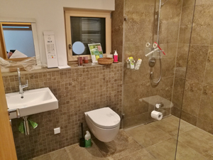 Badezimmer mit Dusche und WC,