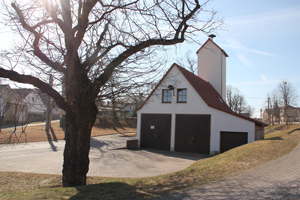 Beim Neubau des Gerätehauses machte es sich erforderlich, eine in der Ausfahrt stehende Eiche zu fällen. Während der Einweihung des neuen Objektes wurde auch eine Bodenpaltte zur Erinnerung an die einstige Friedenseiche geschaffen, wobei der Wehrleiter den Entwurf dazu fertigte und die Firma Widdermann die Umsetzung realisierte. Die Eiche wurde schließlich auf dem gegenüberliegenden Sperlingsberg (im Hintergrund) neu gepflanzt.